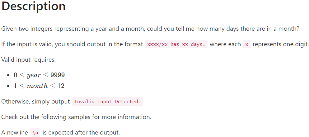 (y>=0&&y<=9999&&m>=1&&m<=12)?printf("%04d/%02d has %d days.\n",y,m,m==2?((y%100==0?(y%400==0?1:0):(y%4==0?1:0))==1?29:28):((m*2-15)>0?(m*2-15):(15-m*2))%4==1?31:30):printf("Invalid Input Detected.\n");